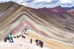Tourists in the Vinicuna ‘Rainbow mountain’. Cordillera Vilcanota, Cusco, Peru. Photo by marktucan en istockphoto.